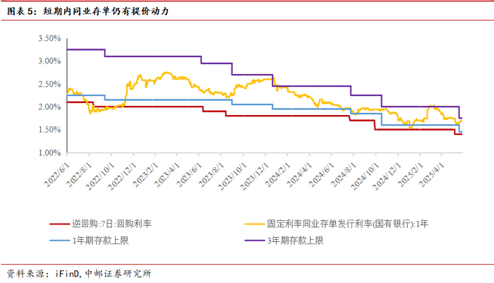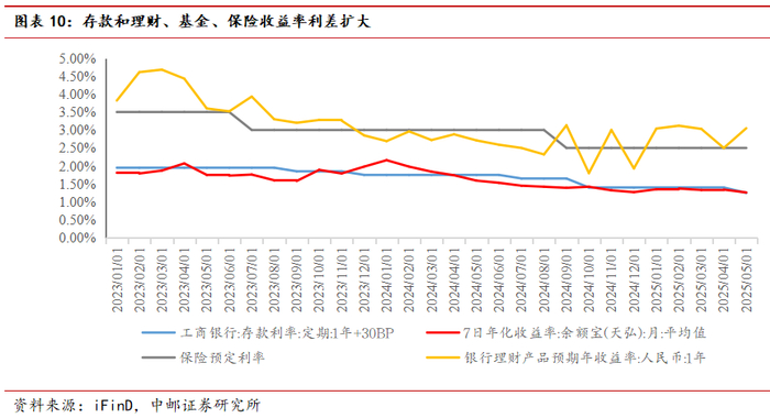 ②从存款、银行理财、货币基金和保险比价结果来看,阶段性出现存款与理财、货币基金、保险利差扩大。结合近几年存款挂牌利率调整规律,存款利率下调后最近的一个季末时点居民存款同比少增,但是考虑到理财、基金和保险托管资金账户主要开立在国有银行和股份制银行,对其负债端冲击或低于历次。