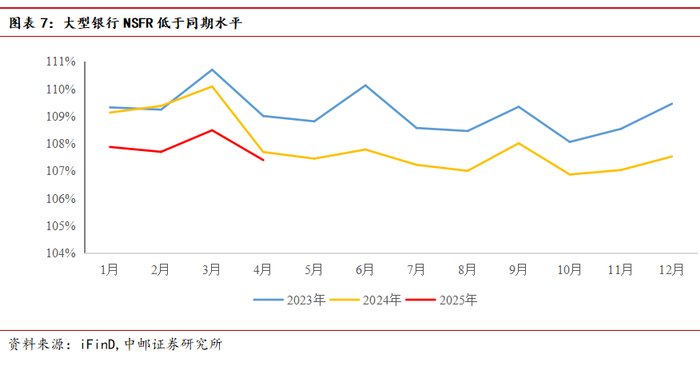 我们录得4月大型银行NSFR为107.40%,连续4个月份低于2023年和2024年同期,推测原因是资产端中长期贷款和长期限债券投资比重上升,负债端则是居民存款流向非银造成核心存款比重下降。NSFR为季度考核,预计5月NSFR或呈现季度性下行后,6月NSFR或季节性上行。考虑指标压力,后续银行新发同业存单期限一年期比重或明显上升。