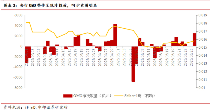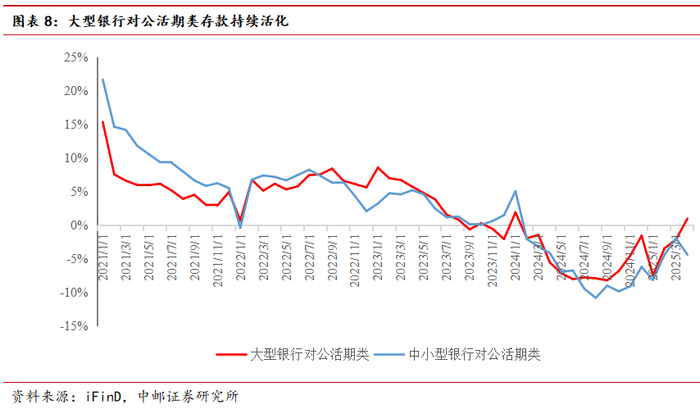 从4月银行系统活期类资金走势来看,税期对于银行对公活期类资金形成一定扰动,中小银行对公活期类存款增速环比有所下滑,但整体趋势仍呈现改善。5月-6月来看,中邮证券宏观团队《5月经济高频数据环比回暖》报告指出经济景气度环比回暖,高频指标反应的宏观基本面改善有望带来银行存款活化,对公活期类存款修复有望超预期。5月中旬两办下发《关于持续推进城市更新行动的意见》、5月20日发改委指出“力争6月底前下达完毕今年全部‘两重’建设项目清单”。发债和项目落地速度有望加快,财政资金支用加快有望超季节性带来银行间资金补充。