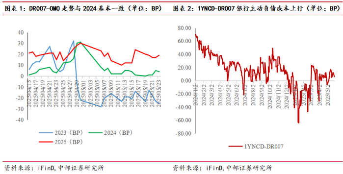 4月16日-5月23日,银行间资金整体走势与2024年基本一致,相较于2023年波动性更大。从DR007-OMO利率来看,4月中下旬受税期影响资金利率震荡上行,5月受票据集中到期资金回流影响资金趋于下行,5月15日受MLF和同业存单集中到期影响,银行或出现阶段性资金头寸管理压力,整体资金震荡趋紧。