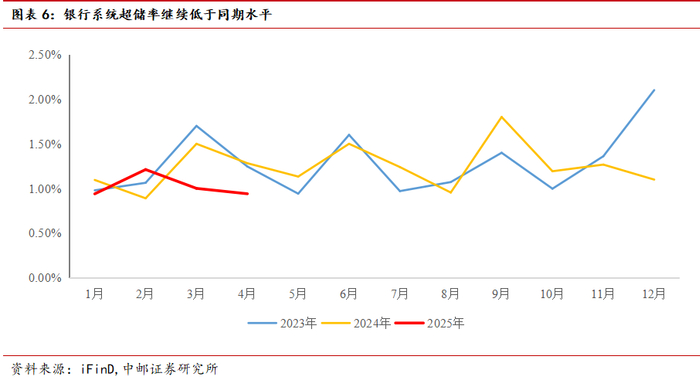 我们测得2025年4月超储率0.94%,继续低于过去两年同期水平。推测超储仍然偏低原因有二,一是4月财政存款增加幅度高于预期,对超储形成消耗;二是资金利率中枢对比OMO利率历史同期来看相对较高,适当增加融出而非存放央行或有利于增厚收益。