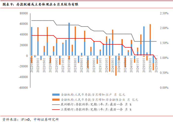 超储率等:我们测得2025年4月超储率0.94%。录得4月大型银行NSFR为107.40%,连续4个月份低于2023年和2024年同期。考虑指标压力,后续银行新发同业存单期限一年期比重或明显上升。税期对于银行对公活期类资金形成一定扰动,中小银行对公活期类存款增速环比有所下滑,但整体趋势仍呈现改善,后续对公活期类存款修复有望超预期。