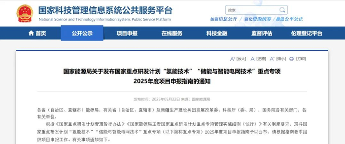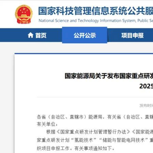 近日,国家科技管理信息系统公共信息服务平台发布《国家能源局关于发布国家重点研发计划“氢能技术”“储能与智能电网技术”重点专项2025年度项目申报指南的通知》。