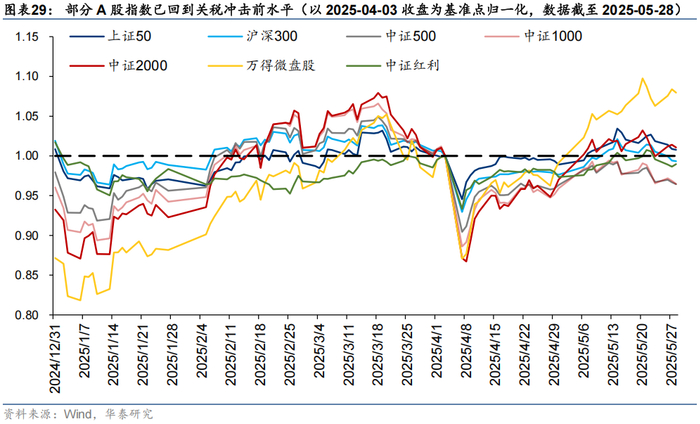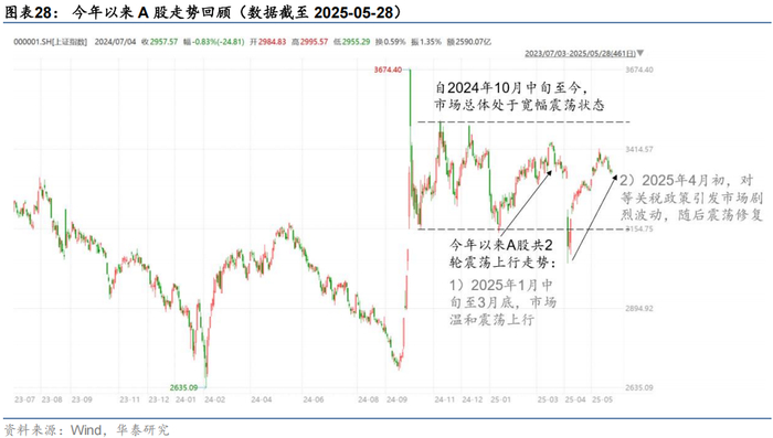自2024年10月中旬至今,上证指数总体呈现在3000至3500点间宽幅震荡的状态。今年以来A股市场共出现2轮震荡上行走势:1)2025年1月中旬至3月底,市场温和震荡走强;2)2025年4月初,特朗普对等关税政策引发市场剧烈波动,随后逐渐修复,近期关税政策有所和缓,市场风险偏好提升,A股部分指数已回到关税冲击前水平。未来半年我们判断A股仍以震荡走势为主: