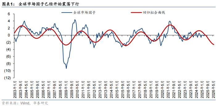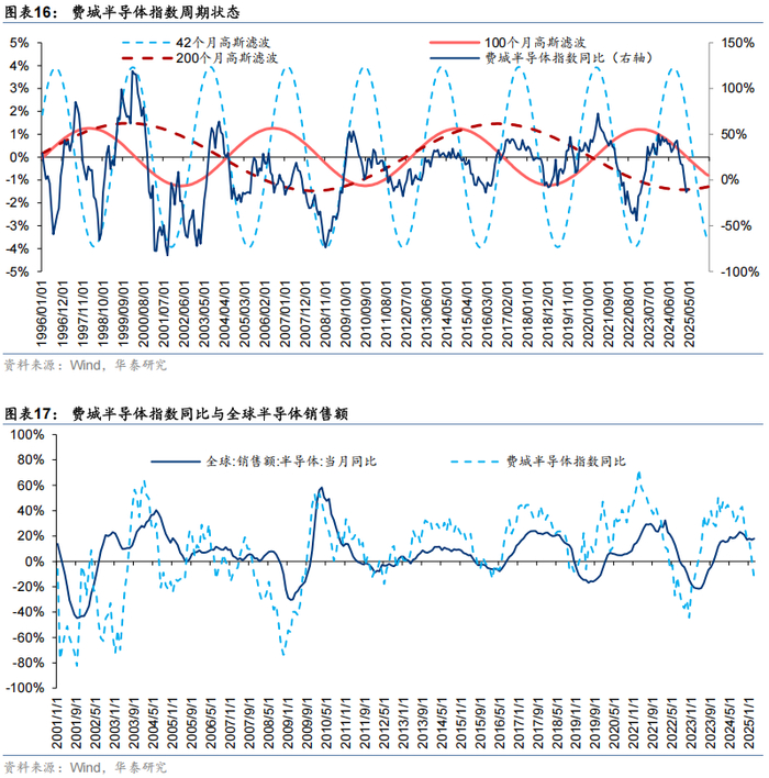 美股23年以来的上涨,与AI繁荣息息相关,费城半导体指数的同比序列在24年11月以来进入下行通道,3月份以来同比值已经为负。与此对应的,全球半导体销售额当月同比在24年10以来也开始掉头向下,费城半导体指数的同比序列与全球半导体销售额当月同比的同步性很高,根据42个月短周期的时间长度,大概率会下行至26年年中。