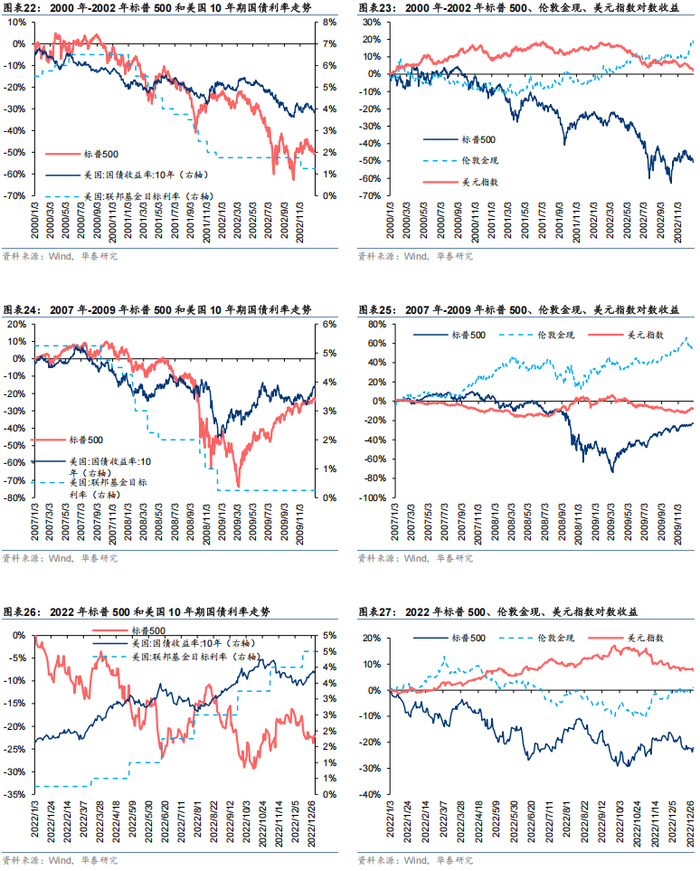 1、美债对危机的对冲作用主要依赖于政策利率的下行。从十年期美债利率来看,在互联网泡沫和次贷危机期间,前期下跌的对冲作用最为明显,也就是政策利率初次下降附近,十年期国债利率的下降往往较为流畅,但在中期,比如2001年全年10年期美债利率仅下行5bp,而联邦基金目标利率则下降了475bp。在2008年下半年也出现了10年美债利率横盘震荡的情形。因此,在下跌中期美债的对冲作用相对较弱。另外,如果政策利率没有下行,比如2022年,在加息的环境中,美债无法对股票市场的下跌起到避险作用。反而会成为新的风险。