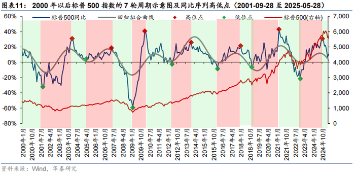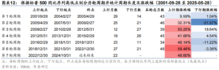 2001年9月底以来,标普500指数经历了7轮周期,对历轮周期上行阶段和下行阶段的时间长度、涨跌幅度进行统计可以发现,在同比上行期指数表现相对较强,在下行期指数表现相对较弱。这7轮周期中最长的为48个月(第6轮),最短的为34个月(第5轮),是因为这两轮周期长度受到了疫情因素扰动,故存在一些偏离。目前标普500处于第7轮周期的下降期,下行开始于2024年11月,过去6轮,下行期最短的为11个月,最长的为27个月,平均为20个月。