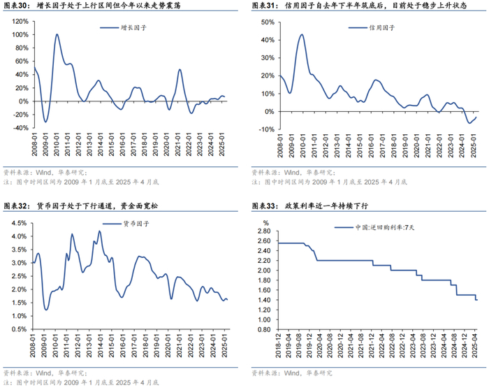 从分子端来看,增长因子自2022年下半年开始进入上行区间,今年以来走势比较震荡。4月制造业PMI由于受到关税冲击降至荣枯线以下,但OECD领先指标环比上行。短期来看国际形势整体趋向稳定,但中期视角下关税政策仍有反复的可能性,关税政策对经济的实质性影响可能会继续发酵,需及时关注国内外政策变化及基本面数据带来的增量信息。