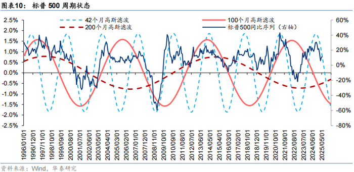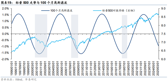 另一方面,在100个月周期下行至底部附近时,美股有较大概率出现大幅度的波动。过去三轮100个月周期的底部分别在2001年7月、2009年11月、2018年3月。2000年3月至2002年10月,由于互联网泡沫破灭,标普500区间最大回撤为50.50%;2007年10月至2009年3月,由于08年金融危机,标普500区间最大回撤为57.06%;2018年1月至12月,由于流动性冲击及美联储加息的影响,标普500区间最大回撤20.21%,如果考虑到之后2020年疫情的冲击,标普500最大回撤为35.41%。目前100个月周期已经进入下行的后半程,叠加42个月周期下行,美股出现较大回撤的概率很大。25年2月至今,标普500最大回撤为21.35%,这与我们的判断一致。但我们并不认为回撤已经结束,目前市场反弹已近尾声,估计未来仍然有较长的回撤时间。