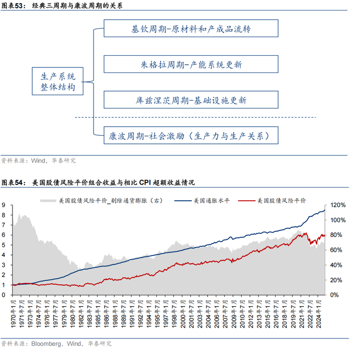 对美国财政问题的担忧实际上也是对美元信用问题的担忧,这其实是康波周期下行带来的主要问题。基钦周期、朱格拉周期、库兹涅茨周期其实都是描述信用的需求周期,周期的生成机制都是供给和需求的错位,利率在经典三周期框架下与经济活跃程度正相关。而在描述康波周期时,康波周期的方向与利率负相关。在康波周期的上行期,经济各部门的债务偿还能力是不断提升的,债务规模的扩张速度是慢于生产力的提升速度的,因此信用成本不断下降,反映在利率上,就是长期利率中枢不断下行。在康波周期的下行期,债务规模过大,债务的持续性存疑,经济增长已经无法支撑债务增长,经济系统各部门的偿债能力下降,信用成本开始上升,导致利率长期中枢上行。与之伴随着可供观测的指标是信用资产的收益表现与通胀的关系。股债风险平价组合可以作为信用资产组合的代表,当其收益超越通胀时,说明信用资产的利润可以维持债务扩张,经济活动反应在资产价格上是有超额利润的,当其收益低于通胀时,说明信用资产无法产生超额利润,自然将制约债务的扩张能力。