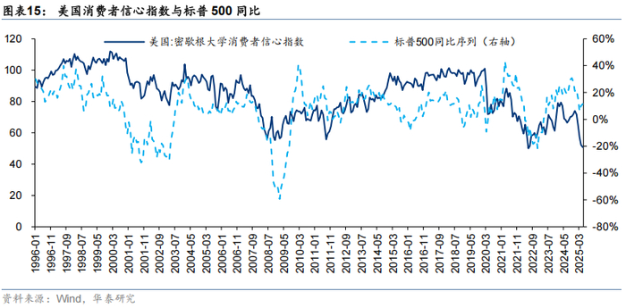 基钦周期又叫库存周期,刻画的是经济短期的波动,其周期长度大约在三年半左右。从资产价格同比和宏观指标的自身波动上,就比较容易观察到这个周期。标普500指数的同比高点出现在24年10月,价格高点出现在2025年2月19日,价格高点大约滞后同比高点4至5个月,这与之前研究结论基本一致。短周期的下行其实在很多宏观指标上也能找到一些迹象,例如标普500指数的同比与制造业PMI以及PMI新订单指数相关性很高,在标普500同比明显下行的同时,美国制造业PMI新订单也出现了见顶的迹象。同时,美国消费者信心指数也出现明显下行,创造了23年以来的新低。