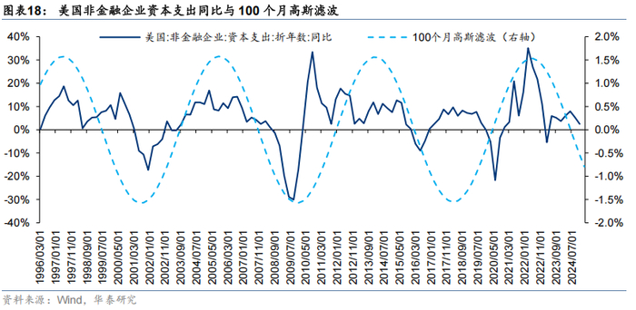 100个月的中周期也被称为朱格拉周期,常用于描述产能周期或资本开支周期。美国非金融企业资本支出同比大体呈现出100个月周期的特征,2022年以来整体上呈现下行态势,这与100个月周期走势一致,且最近一个季度美国资本支出同比也出现了下行。
