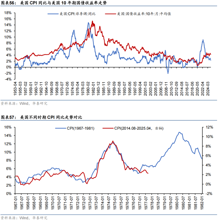从具体的传导路径上来看,美国较高的财政赤字需要较高的国债发行规模来支撑,如果实行财政货币化手段,由美联储购买政府发行的国债,则之后大概率会导致通货膨胀,在此情形下政策利率大概率要随之上行。如果市场承接财政部发行的国债,则市场利率大概率会出现上升,并带来资产价格的下跌。两者都会造成利息支出的进一步增长,从而使得财政缺口继续加大。在此情形下,有较大概率政府与居民被迫提高对高通胀、高利率的容忍度,导致高利率、高通胀、高财政赤字同时存在。从历史情景来看,高利率与高通胀往往是伴生的,利率与通胀的走势更多是正相关而非负相关。