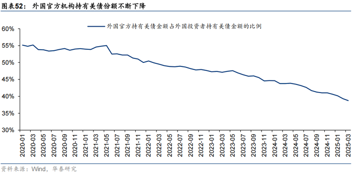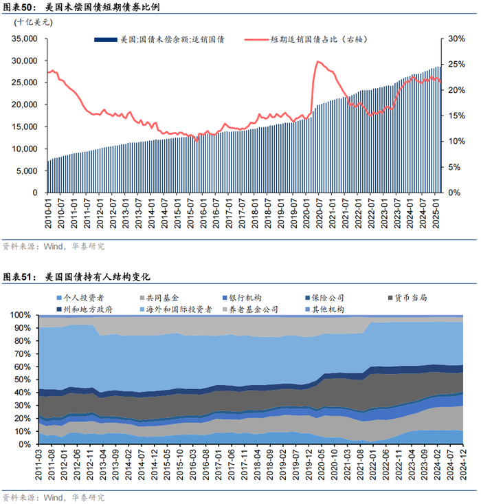 2024年美国财政赤字为1.8万亿美元,占GDP比重6.36%。最近三年,财政赤字一直处于上升势头。目前国债市场上未偿适销国债为28万亿美元,一年以内到期的短期国债占比21.54%,较高的短期债券占比带来了较高的再融资需求。另一方面,美债的投资者结构也在悄然发生着变化。2011年,海外和国际投资者持有48%的美债份额,2024年,海外和国际投资者仅持有33%的美债份额,海外和国际投资者在快速退出美债市场。同时,过去三年美国货币当局持有的美债份额从26%下降至15%,养老基金公司持有的美债份额从12%下降至4%,取而代之的是个人投资者持有的美债份额从2%上升至10%。也就是说美债市场的散户占比逐渐走高。更重要的是,作为美债重要投资者的海外官方机构,持有美债比例也在迅速下降,根据万得数据统计,外国投资者持有美债金额约为9万亿美元,其中外国官方持有的美国长期证券金额约为3.5万亿,外国官方持有的美国长期证券金额占外国投资者持有美债金额从2020年的55%下降至2025年一季度的38%。据此估算,2020年至今,外国官方机构持有的美债份额大约从18%下降至12%。根据美债持有人结构的变化大概可以判断,海外官方机构、养老基金等战略投资者在减少美债上的投资,我们认为这些战略投资者更接近美债市场上的“聪明资金”。美债持有人结构的变化实际上增加了美债市场的不稳定性,当然,如果未来“聪明资金”再度回归,可能就是投资美债的更优时机。