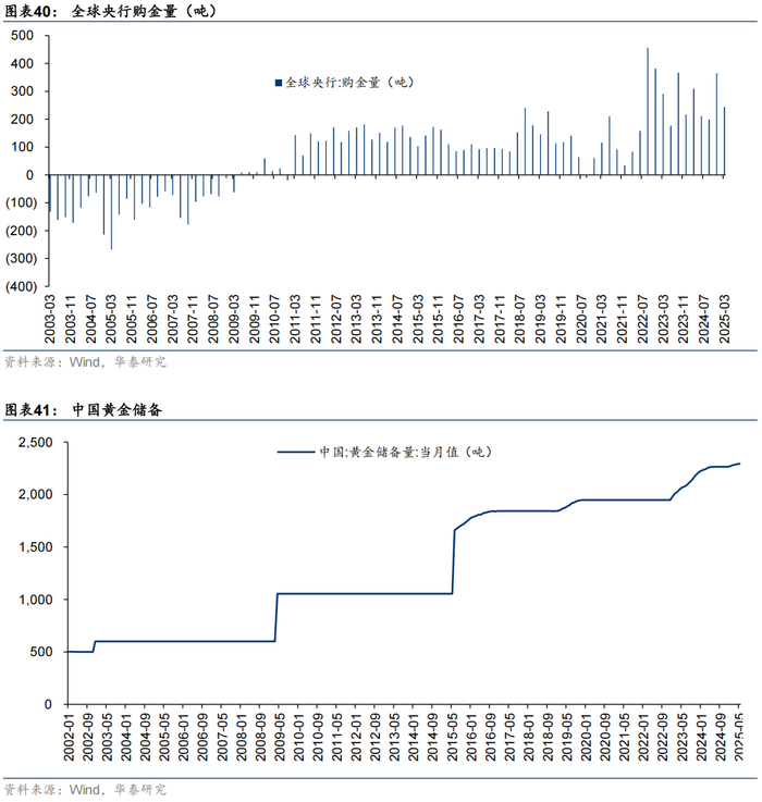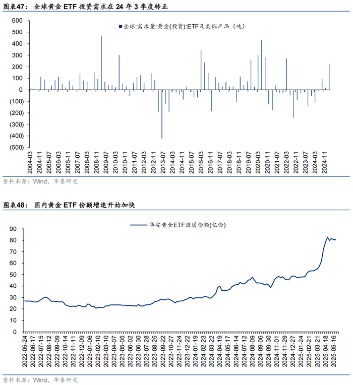 黄金最近两年上涨趋势逐渐加强,以伦敦金现为基准,2024年黄金价格上涨27.23%,今年以来上涨27.95%。我们前期多次在报告中提示黄金的配置价值,《黄金可能是未来更好的财富储存介质》(2023-12-05)、《黄金突破前高,或开启新一轮上涨》(2024-03-06)、《黄金依旧处于上行趋势》(2025-03-02)等报告中都提到黄金的长期配置价值。过去两年,黄金的投资范式出现了明显的变化。在此之前,黄金的分析框架重点关注利率、通胀和美元指数,黄金投资重点跟踪实际利率,当实际利率走低时,黄金价格上涨。但最近两年,黄金成为了对冲主权国家财政问题的工具。各国央行成为了黄金的重要买家,根据万得数据,2024年,全球央行购金1085.96吨,全球黄金总供应量4987.76吨(包括金矿和回收金),全球央行购金占黄金总供应量的21.78%,这是黄金投资走出新范式的重要力量。我们认为,黄金投资是全球央行和普通投资者在应对康波下行带来的财政问题的较优选择,黄金是天然的货币,其稳定的价值不因政治因素而改变。在目前全球贸易前景和财政前景愈发不确定的情境下,黄金的长期配置价值将更加凸显。当然,由于黄金上涨势头较好,吸引了更多的投资资金,今年以来,通过黄金ETF投资黄金的资金明显增加,使得投资需求和价格进入了正反馈的螺旋,黄金价格有自我加强的趋势,这使得今年黄金投资的波动相比去年可能会有所加大。因此,逢低布局可能是更优策略。