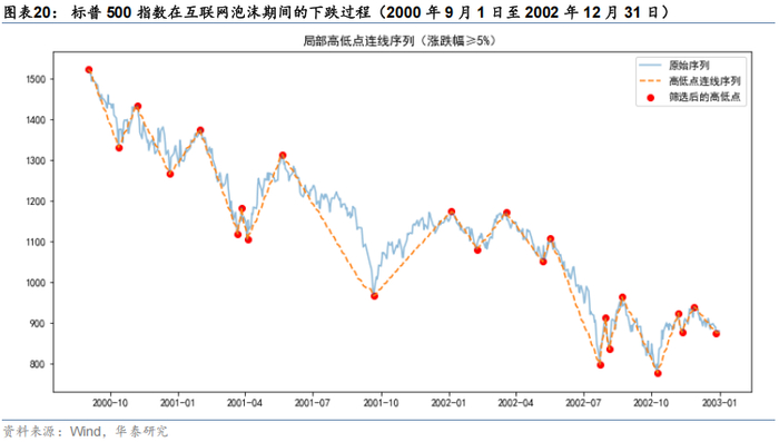 2000年9月份至2001年5月份,标普500呈现出较为规则的锯齿状下跌,下跌速度和反弹速度相对均匀,没有出现明显加速的迹象,高低点连线的斜率也较为一致。2001年5月份之后,指数下跌速度出现了先减速后加速的过程,2001年9月下跌速度很快,有较为明显的流动性危机的迹象。之后有两个季度市场状态好转,反弹幅度超过20%,2002年5月至7月则再次出现了大幅下跌。互联网泡沫期间市场的下跌时间较为漫长,从2000年9月下跌至2002年10月,两年左右的下跌时间,下跌区间大约占60%,反弹时间大约占40%。市场反弹的时间长度大概率不会超过之前下跌的时间长度,也可以通过这种方法来判断目前行情的反弹进度。
