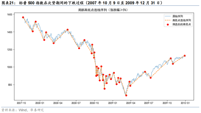 次贷危机时间标普500的下跌与互联网泡沫时期有相似也有不同,相同的是下跌初期都是相对缓和的锯齿状下跌,不同的是在下跌后期,下跌速度更快、市场波动更大,流动性危机与市场失灵的迹象更为典型。2008年10月初,标普500在8个交易日中下跌了23%,这是雷曼兄弟破产后市场跌速最快的阶段。之后两个月的时间里市场走势暴涨暴跌,出现了1天指数反弹11%和5天指数下跌17%这样的极端行情。直到2009年3月份,市场才真正进入筑底。整个下跌过程持续了一年半。