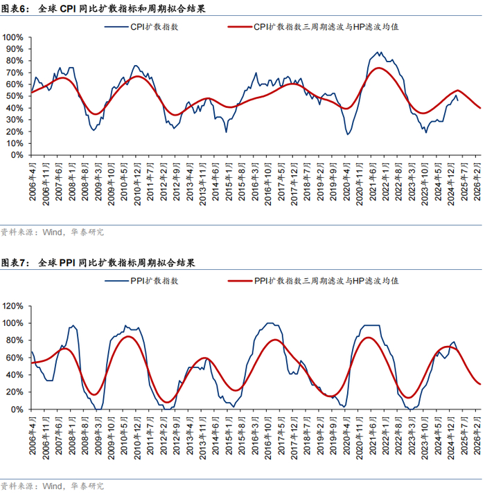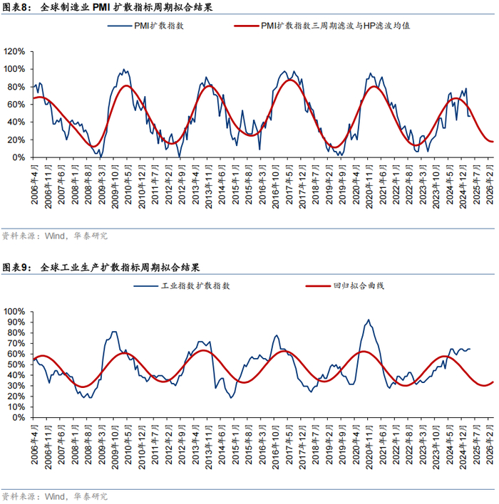 下列图表展现了全球宏观指标的周期状态,根据周期模型的拟合结果,全球CPI扩散指数出现下行;全球PPI扩散指数本轮基钦上行周期起始于2023年4月,近期在周期高位附近震荡;全球制造业PMI扩散指数自2022年10月开始回升后,已经连续在高位震荡半年,未来或进入周期下行区间。