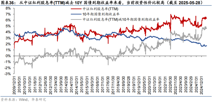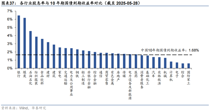配置红利底仓的好处主要有三个:a) 关税政策存在一定的反复风险,且关税对基本面的影响或逐步显现,红利资产具有较高的防御价值;b) 《推动公募基金高质量发展行动方案》发布后,基金资产配置有望进一步贴向沪深300等业绩基准,市场风格或逐步偏向核心资产、红利资产;c)国内处于低利率环境,中证红利股息率高于10年期国债收益率,配置红利底仓有助于获取稳定现金回报。具体来说,可以关注股息率较高的银行等行业。
