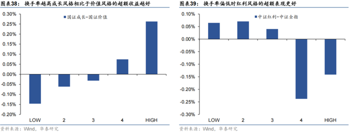 从微观交易层面来看,成长和红利风格对于市场交易热度的反应也正好互补。将中证全指2010年以来的周度换手率从低到高排序分为5组,分别统计成长超额收益(国证成长和国证价值周度收益率之差)、红利超额收益(中证红利和中证全指周度收益率之差)在不同换手率分组下的中位数。结果显示,当换手率高,市场交投活跃时,成长风格的超额收益显著;而当换手率偏低,市场交投清淡时,红利风格的超额收益更稳健。两者搭配后,不管市场交易热度是高还是低,总有一端能够提供超额收益,在降低组合波动的同时,有效提升持有体验,避免情绪化决策带来的追涨杀跌。