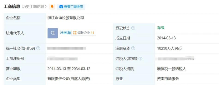 天眼查显示,永坤黄金的经营实体为浙江永坤控股有限公司,成立于2014年,实控人为汪国海。
