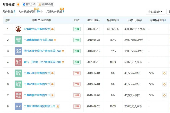 除永坤黄金外,浙江永坤控股有限公司还投资多家黄金相关公司。