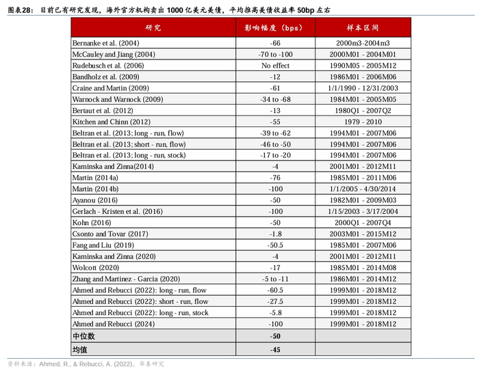 海外投资者减持美债,可能推高美债收益率隐含的期限溢价,从而推高美债收益率的中枢。2024年底海外投资者持有美债存量中的三成左右,其中海外官方机构持有的规模为3.56万亿美元,占存量的12.6%。随着美元储备地位的回落,海外投资者特别是官方机构一定程度上卖出美债,可能推高美债收益率所隐含的期限溢价。例如,目前已有研究发现,海外官方机构卖出1000亿美元美债,推高美债收益率10-90bp,平均50bp左右(图表28)。如果海外投资者减持美债是有序进行,预计将逐步推高美债收益率的中枢水平。但是,如果海湖庄园协议落地,或者投资者对美国政府债务可持续性的担忧再度上升,美债收益率可能出现无序上行。