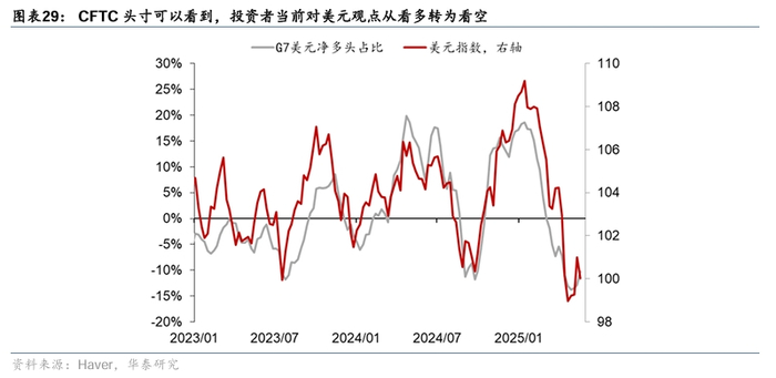 投资者削减美元敞口,或者增加对美元汇率的对冲,美元指数中枢或有所下降。正如此前所论述,美元当前被高估15-20%。从CFTC头寸可以看到,投资者当前对美元观点从看多转为看空(图表29)。美元储备货币地位缓慢下降的情况下,美元短期走势受到关税进展以及美国经济周期影响,目前看仍有继续下行空间。但如果出现冲击导致美元储备货币地位被严重削弱,私人和公共部门集中减持美元资产,美元或将出现大幅下跌。