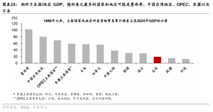 从国别层面来看,对美累计顺差多的国家可能超额美元资产最多。正如我们此前所论述,虽然美股、美债的投资者“名义国别”各异,但通过追溯过去20-30年间各国对美国的累积顺差额,我们可以大致判断全球美元“散落”在哪些国家/地区的广义资产负债表上。1990年来对美累积顺差最多的国家和地区是中国(7.1万亿美元)、欧盟(3.4万亿美元)、日本(2.3万亿美元)、东盟(2.2万亿美元);而相对于本国/地区的GDP,囤积美元最多的国家和地区可能是墨西哥、中国台湾地区、OPEC、东盟、日本(图表22-23)。过去10余年中国出口商可能超配美元资产超过1万亿美元,而2021年至今,未结汇收入可能接近5000亿美元(图表24)。