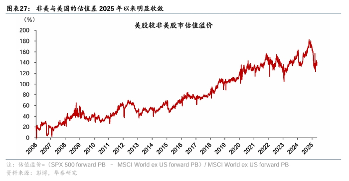 非美与美国的估值差可能进一步收敛,从而削弱美股相对回报。2006年以来,以forward PB衡量的美股与非美市场估值差不断走高,2024年末达到历史高位的171%,但特朗普再度执政之后,2025年以来出现逐步收敛的现象,截至2025年4月降至144%(图表27)。虽然美股仍较非美维持较高的估值溢价,但中长期看全球美元资产配置“再平衡”或将进一步削弱美股的估值溢价。