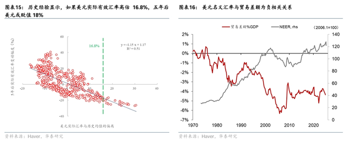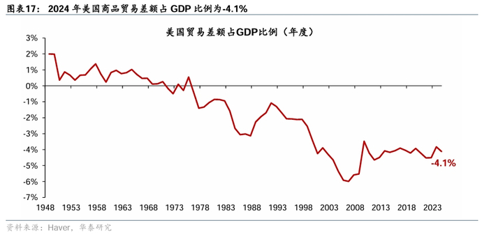 如果特朗普计划通过汇率贬值收窄美国贸易逆差,美元可能需要贬值15%以上。PIIE(2010)[9]指出,美元汇率贬值10%,3年后美国经常账户占GDP之比改善1.4个百分点;IMF(2015)[10]的研究也认为,实际有效汇率贬值10%会导致实际净出口占GDP提高1.5个百分点,需要几年的时间显现,大部分调整都会发生在第一年。2024年美国商品贸易逆差占GDP之比为4.1%(图表16-17),如果完全通过汇率调整消除贸易逆差意味着美元汇率需要贬值27%。二战以来,美国商品贸易占GDP之比为-1.8%,若回到这一历史均值,商品贸易逆差占GDP之比需要收窄2.3个百分点,这意味着美元汇率需要贬值15%。