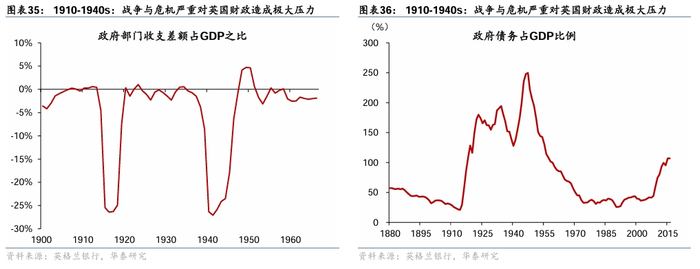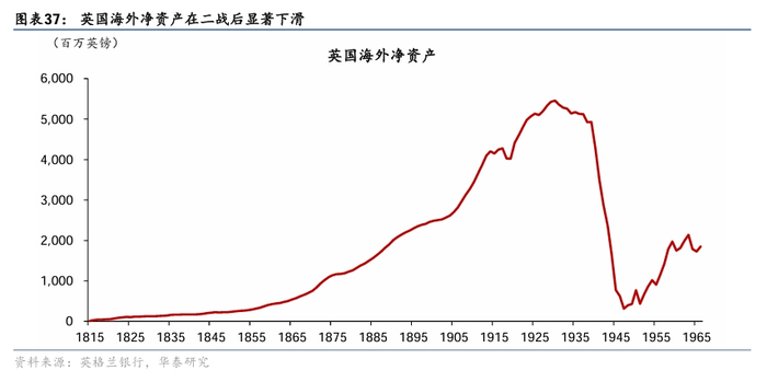 两次大战削弱英国财政能力,海外资产规模亦显著下滑。两次大战期间英国财政赤字大幅扩张,财政赤字削弱兑现能力,大幅削弱了英镑维持固定兑金承诺的能力。在金本位体系下,这种财政赤字通常意味着货币供应扩张,但由于黄金储备难以同步增加,市场对英镑的信心迅速削弱。此外,英国殖民体系也受到挑战。两次世界大战后,英国虽仍然维持英联邦体系,但已与历史趋势相背,其海外净资产规模亦迅速下降,英国已无力通过海外投资收益的方式来维持经常项目顺差,其对外输出英镑的能力和国际结算使用英镑的需求出现趋势性走弱。