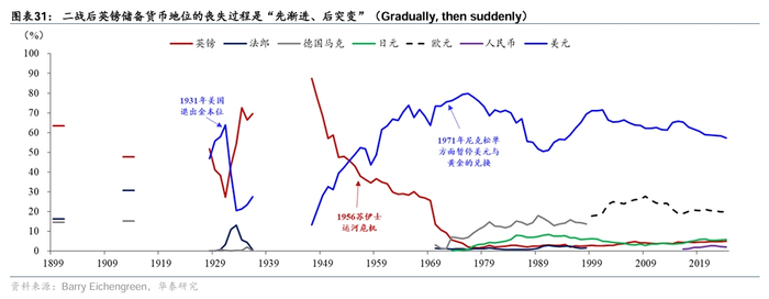 二战后英镑储备货币地位的丧失过程是“先渐进、后突变”(Gradually, then suddenly)。19世纪中叶至20世纪初期,英镑为全球最重要的储备货币。二战对英国造成巨大冲击,其丧失大量海外殖民地以及对外净资产,美元取代英镑成为最主要储备货币。但英镑区的存在以及储备货币的网络效应[12]在二战结束后的一段时间仍对英镑地位提供支撑,例如英镑在全球外汇储备中占比在二战后仅缓慢下降(图表31)。但苏伊士运河危机成为“最后一根稻草”,标志着英国地位的明显下降,此后英镑在外汇储备中的占比降至个位数(详见附录)。