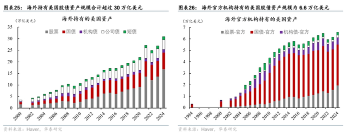 中长期看,美元配置“再平衡”或导致资本从美国流出,从而削弱美股相对回报,推高美债收益率中枢,并可能导致美元偏弱。截至2024年,海外持有的美国总资产达到62万亿美元,其中持有美股、美债、公司债等资产合计规模超过30万亿美元(图表25);海外官方机构持有的总资产规模为6.6万亿美元(图表26)。中长期看,由于美元地位的回落,海外投资者或对其所持有的美元资产进行“再平衡”,这可能导致资本从美国流出,削弱美国资产的相对回报。