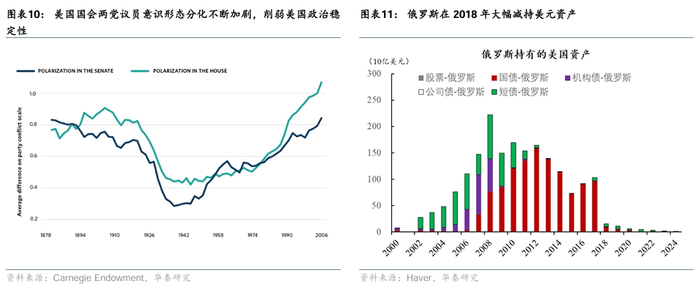 政治极化加剧,削弱美国政府稳定性,特朗普进一步削弱美国政府内部制衡(图表8)。通过DW根据两党议员投票记录测算的意识形态分布[3],可以看到自1960年代以来,国会两党意识形态差距不断上升,并且在近20年出现加速现象。同时,选举分析机构Cook PVI显示[4],美国2025-2026届国会选区中,超过80%的选区是某一党派的安全区,而1999年,该比例为62%。特朗普再度执政以来采取的超越美国一般政治规范争议行为,如追溯国会山事件相关人士、利用DOGE开展带有一定意识形态色彩的机构削减、不经过国会而实质性解散政府机构,某种程度上破坏了美国长期遵循“三权分立”的制度安排与政府内部平衡,进一步加剧了美国两党分裂与政治极化。