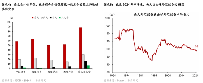 近年来美元储备货币地位的支撑因素边际削弱。美元储备货币的支撑因素包括:美国经济规模、稳定性、金融市场发展以及军事实力等。但上述支撑已经出现边际削弱:1)美国经济规模相对下降,特别是2015年人民币与美元渐进脱钩,美元货币区占比下降;2)政治极化加剧,削弱美国政府稳定性,特朗普进一步削弱美国政府内部制衡;3)美国债务风险不断上升,美债作为安全资产的地位受到削弱,三大评级机构先后下调美国主权信用评级;4)全球地缘政治冲突加剧,俄罗斯、土耳其等国家持续推动去美元化。特朗普2.0后美国快速退出全球治理,进一步降低美元公信力。