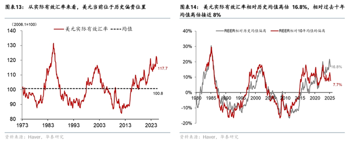 从宏观平衡方法(MB Model)来看,当前美元实际有效汇率被高估10-15%。宏观平衡方法(MB Model)是从宏观经济整体平衡角度出发判断实际汇率是否偏离均衡水平。这种方法在国际货币基金组织(IMF)等机构广泛采用,主要是通过评估经常账户与其经济基本面之间的差距来推导汇率的均衡水平。根据2024年7月IMF的测算[6],2023年美国经常账户占GDP之比为-3%[7],比经常账户占GDP之比的均衡水平低0.7个百分点。IMF认为,经常账户对实际汇率的弹性系数为0.12,这意味着2023年美国实际汇率相对均衡水平被高估5.8%,即美元实际有效汇率如果升值5.8%有助于美国经常账户回到均衡水平。2024年美国账户占GDP之比相对2023年进一步下降0.6个百分点,据此推算[8],2024年美元实际有效汇率被高估10.8%。截至5月31日,美元实际有效汇率比2024年均值高0.8%,据此推测当前美元实际有效汇率高估11.6%。