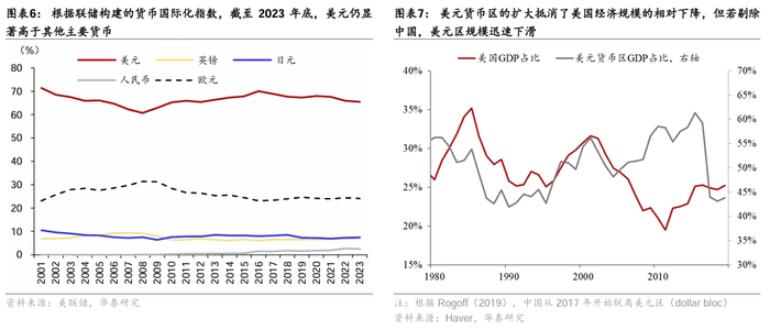 美国在全球GDP中的占比下降,特别是随着人民币逐步与美元脱钩,美元货币区在全球GDP中的占比下降。虽然美国GDP在全球中的占比从1980年代的28%左右下降至2019年的24%,但由于包括中国在内的大量国家汇率一度盯住美元,形成“美元货币区”(Dollar Bloc)[2],美元货币区在全球GDP中的占比并未明显下降,反而在1980年代以后整体回升,对美元地位形成支撑(图表7)。2015年“8·11汇改”以来,人民币由过去单一盯住美元转换为参考一篮子货币(2024年版本CFETS中美元权重为19.5%),人民币逐步与美元脱钩。Rogoff(2019)认为人民币从2017年开始拖累了美元区,从而降低了美元货币区在全球GDP中的占比。往前看,如果人民币汇率灵活性进一步上升,实现清洁浮动,美元货币区占比维持低位,长此以往或将削弱美元储备货币地位。