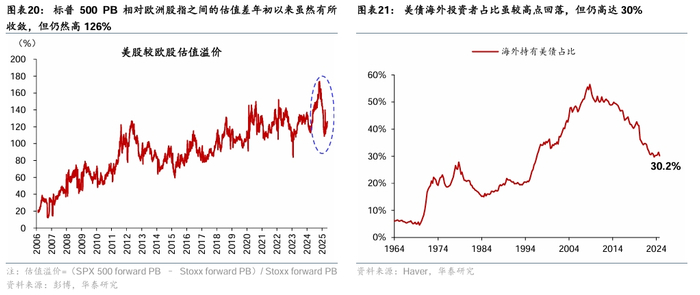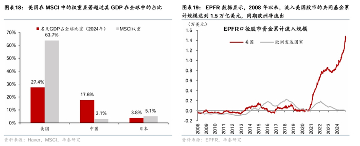 美元资产的超额回报导致海外投资者普遍“超配”美元资产,特别是美股。2008年全球金融危机以后,美股显著跑赢全球其他股市,2008-2024年美股年复合回报达到12.4%,显著超过Stoxx 50(4.6%)和日经225指数(9.9%)。这显著推高了美股在全球股票指数中的占比。例如,虽然2024年美国在全球名义GDP中占比仅为27.4%,但是2025年4月,MSCI ACWI指数中美股占比达到63.7%的高位,而中国占比仅为3.1%,显著低于中国GDP在全球的占比(图表18)。美股的超额回报导致美股被全球投资者超配。2008-2024年海外持有的美国权益类证券投资从2.1万亿增长到18.4万亿美元,年复合增速达到14.5%;EPFR数据显示,2008年以来,流入美国股市的共同基金累计规模达到1.5万亿美元,同期欧洲发达国家股市则存在小幅净流出(图表19)。海外投资者对美股的追捧也推高了美股估值水平,标普500 PB相对欧洲股指之间的估值差年初以来虽然有所收敛,但仍然高126%(图表20)。