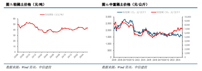 锂:据SMM,部分非一体化锂盐厂不堪成本压力出现减停产动作带来供给减量,5月碳酸锂产出小幅下降,但总量级仍处高位,5月环比减少2%,同比增加15%,氢氧化锂产量环比稳定,同比减少超过20%。消费端保持稳定增长,5月磷酸铁锂产量环比增长约6.7%,同比增长43%,三元材料产量环比增长3.52%,同比增长23.9%。受传统汽车销售淡季影响,动力端需求难以实现突破,磷酸铁锂材料及电芯的排产预期将有所下滑,储能市场在关税下调后,下游电芯厂将继续积极生产并抢出口,需求仍保持强劲增长态势。但对需求整体拉动较为有限。中汽协及工信部反对无序“价格战”及“内卷式”竞争,上游原材料行业供给过剩,“反内卷”督促过剩产能推出,推动价格合理回升。