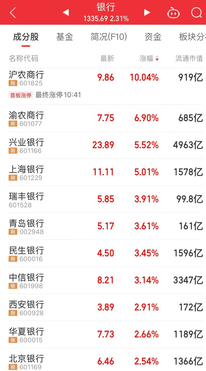 银行板块上午表现强势,沪农商行涨停,兴业银行涨超5%。杭州银行、中信银行盘中股价刷新历史新高。