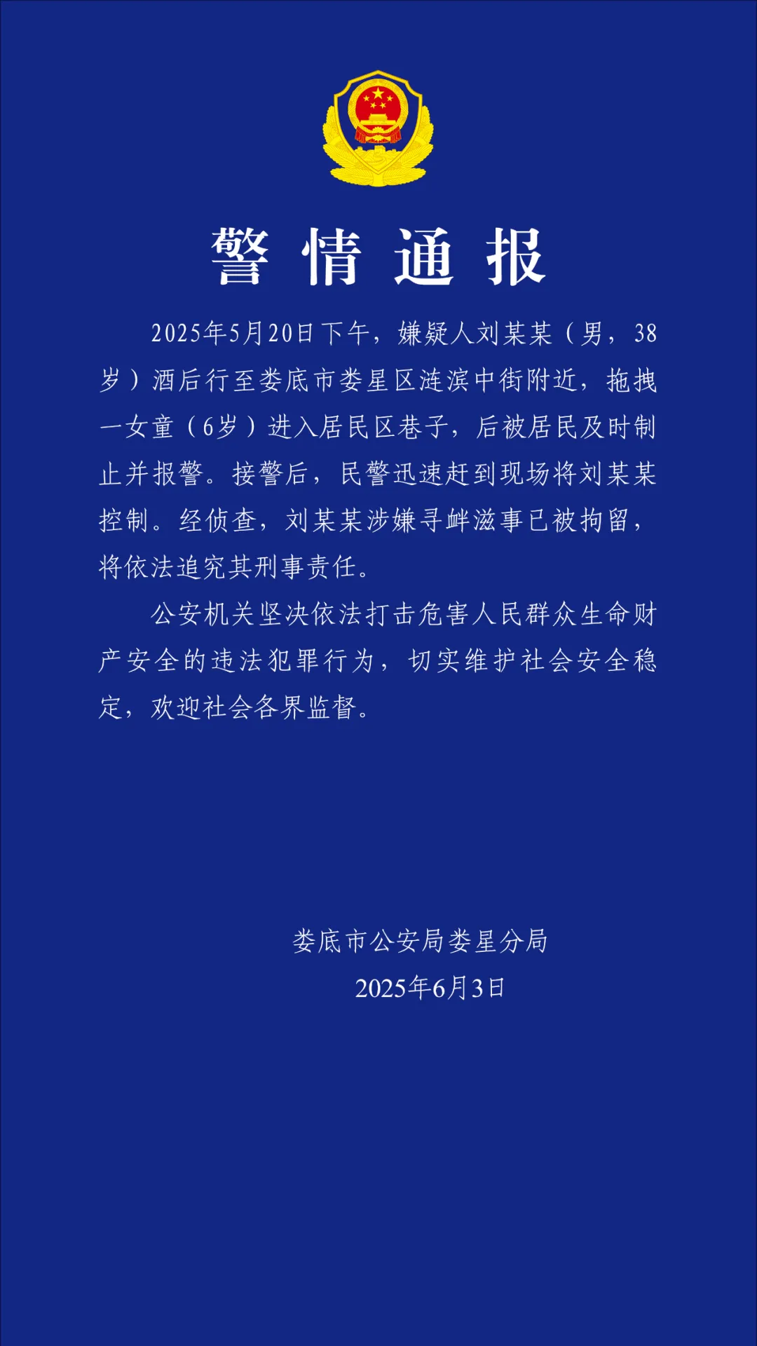 6月3日,湖南娄底市公安局娄星分局发布警情通报: