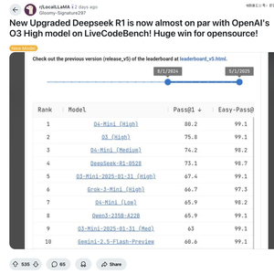 「全新升级的 Deepseek R1 在 LiveCodeBench 上的表现几乎与 OpenAI 的 O3 模型不相上下!开源的巨大胜利!」一名用户发布的帖子标题如此声称。