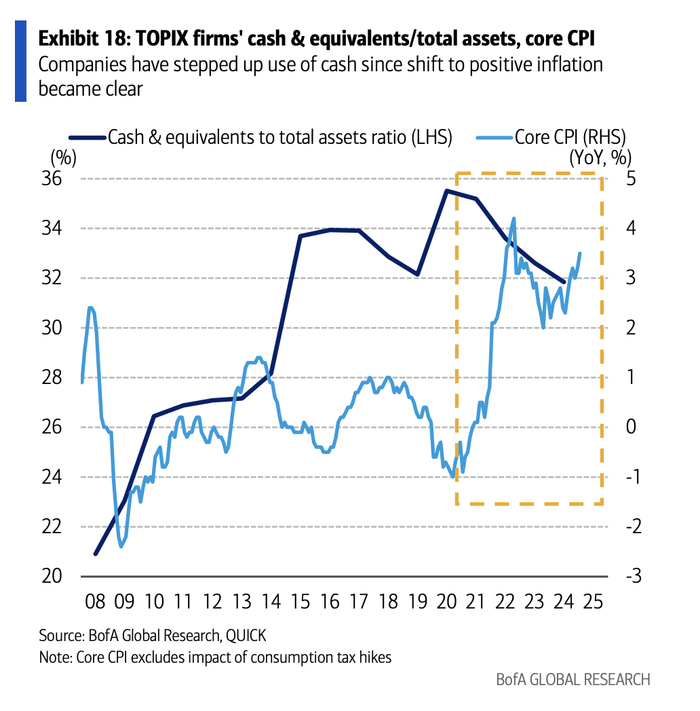向通胀经济的转型已成为企业改革的关键催化剂。首先,企业不再能够为囤积正在贬值的现金找到理由。事实上,日本企业的现金持有量与通胀呈现负相关关系。