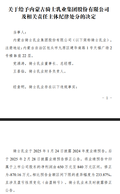 号称北交所乳业第一股的骑士乳业(832786.BJ),在北交所上市后的第二年即业绩变脸、由盈转亏,因为对业绩预测不准确,为此今年4月底北京证券交易所对骑士乳业及公司董事长兼总经理党涌涛、财务负责人王喜临等“通报批评”,并记入证券期货市场诚信档案。要知道骑士乳业在去年9月份因信息披露违规刚被北交所口头警示过。