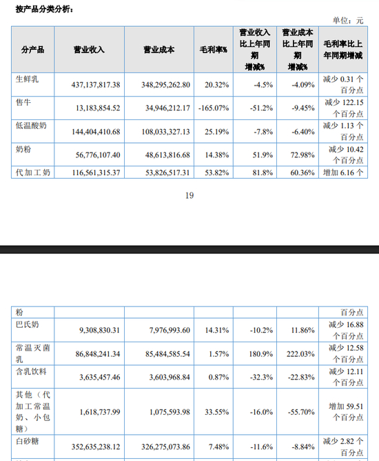 如果从业务板块来看,骑士乳业的三大主业全线承压。生鲜乳、低温酸奶、白砂糖三大亿元级业务2024年营收、毛利率等均同比下降。为数不多的亮点是代加工奶粉的业务增长,但收入规模仅1.17亿元,难以扭转大局。