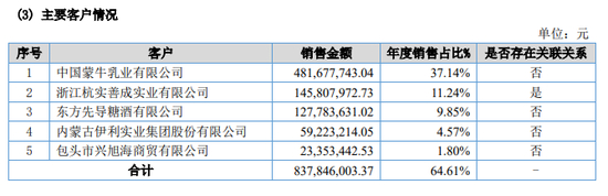 而且,从骑士乳业的销售去向来看,业绩过度依赖大客户的状况十分明显。年报数据显示,骑士乳业的前5家客户,销售金额能占年度销售额的64.61%,其中,蒙牛乳业仍然是骑士乳业最大客户,与蒙牛乳业业务往来的销售额占到了年度销售额的37.14%。