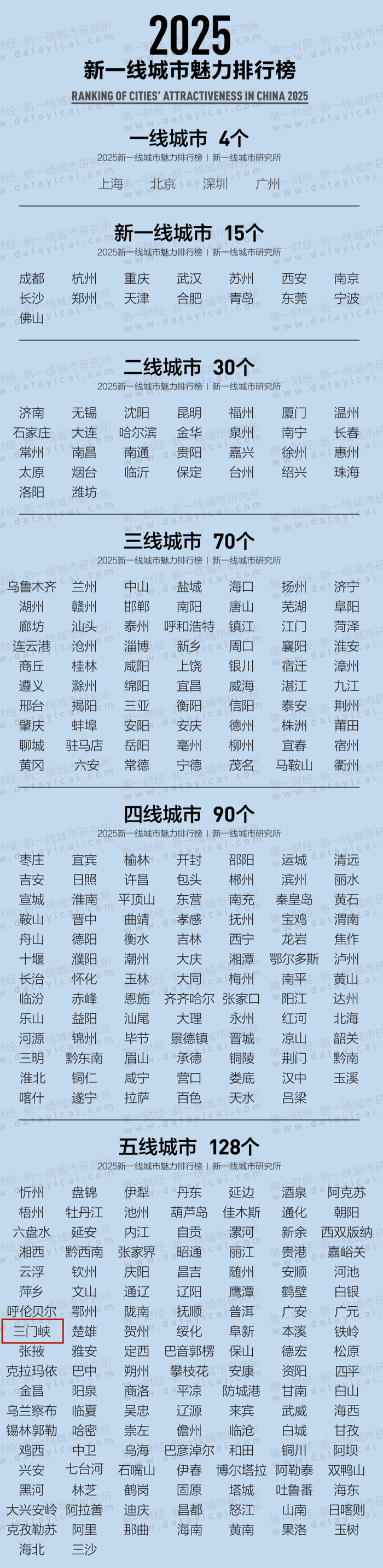在包含中国内地337个地级及以上城市的“2025年城市分级完整名单”中,三门峡位列五线城市。