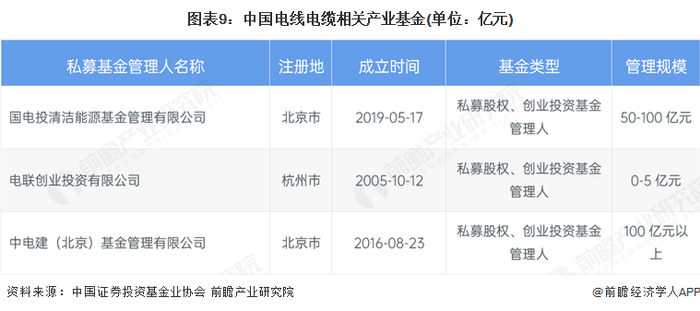 电线电缆不仅是作为国家传统制造行业,也是现代化基础设施体系的重要构成,但由于行业一般制造技术较为成熟,因此专用产业资金较少,但在电力电网不断扩展的背景下,相关基金有望对电线店里行业进行投资。通过在中国证券投资基金业协会中搜索,我们找到国电投清洁能源基金管理有限公司、中电建(北京)基金管理有限公司出资的代表性投资管理有限公司。