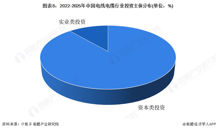 根据对电线电缆行业投资主体的总结,目前电线电缆行业的投资主体以资本类组织机构为主,占比超88%,代表性投资主体有信达资本、建信投资等;实业类的投资主体有长缆科技、泛亚微透等少数几家相关业务布局的企业。
